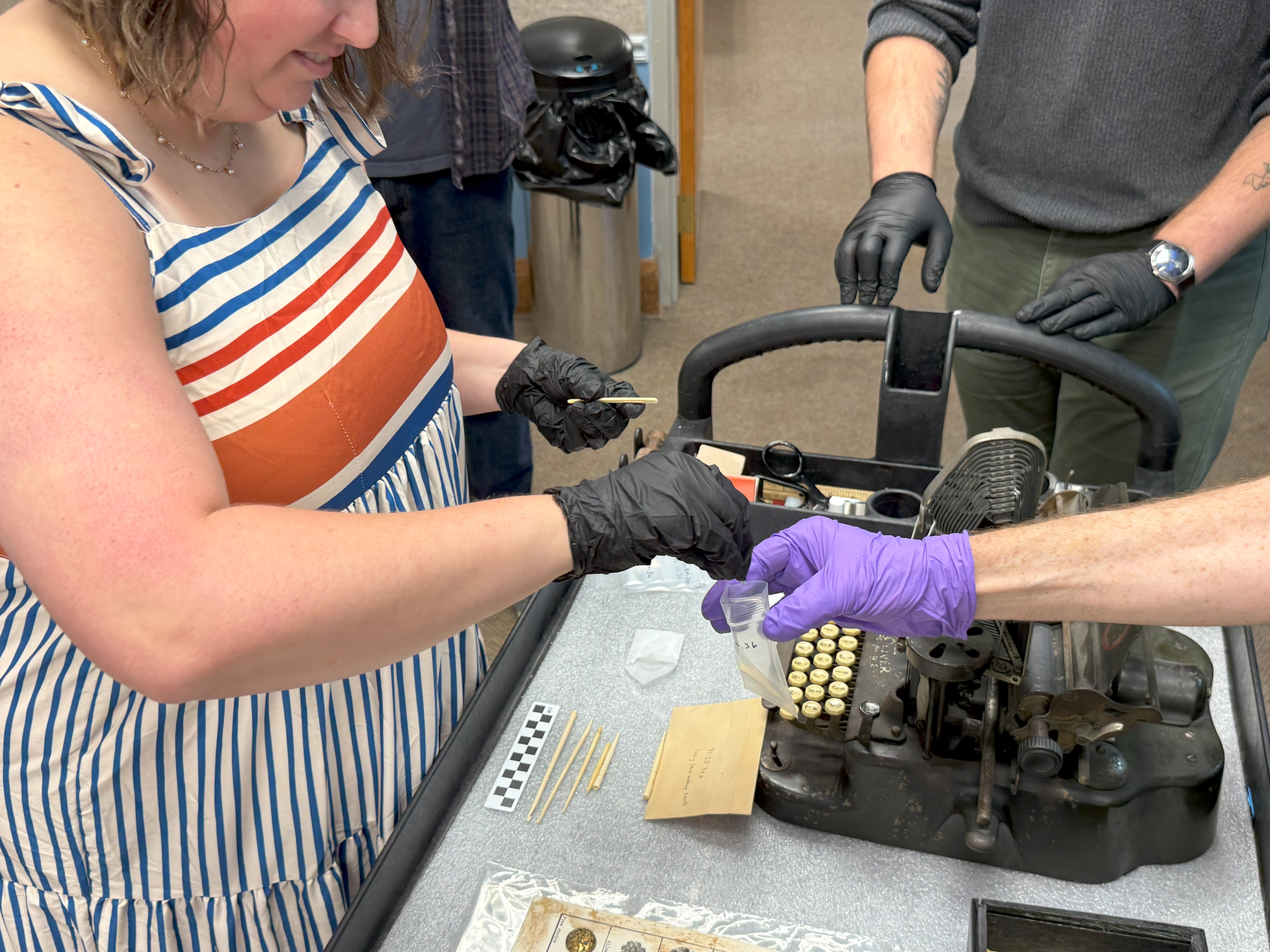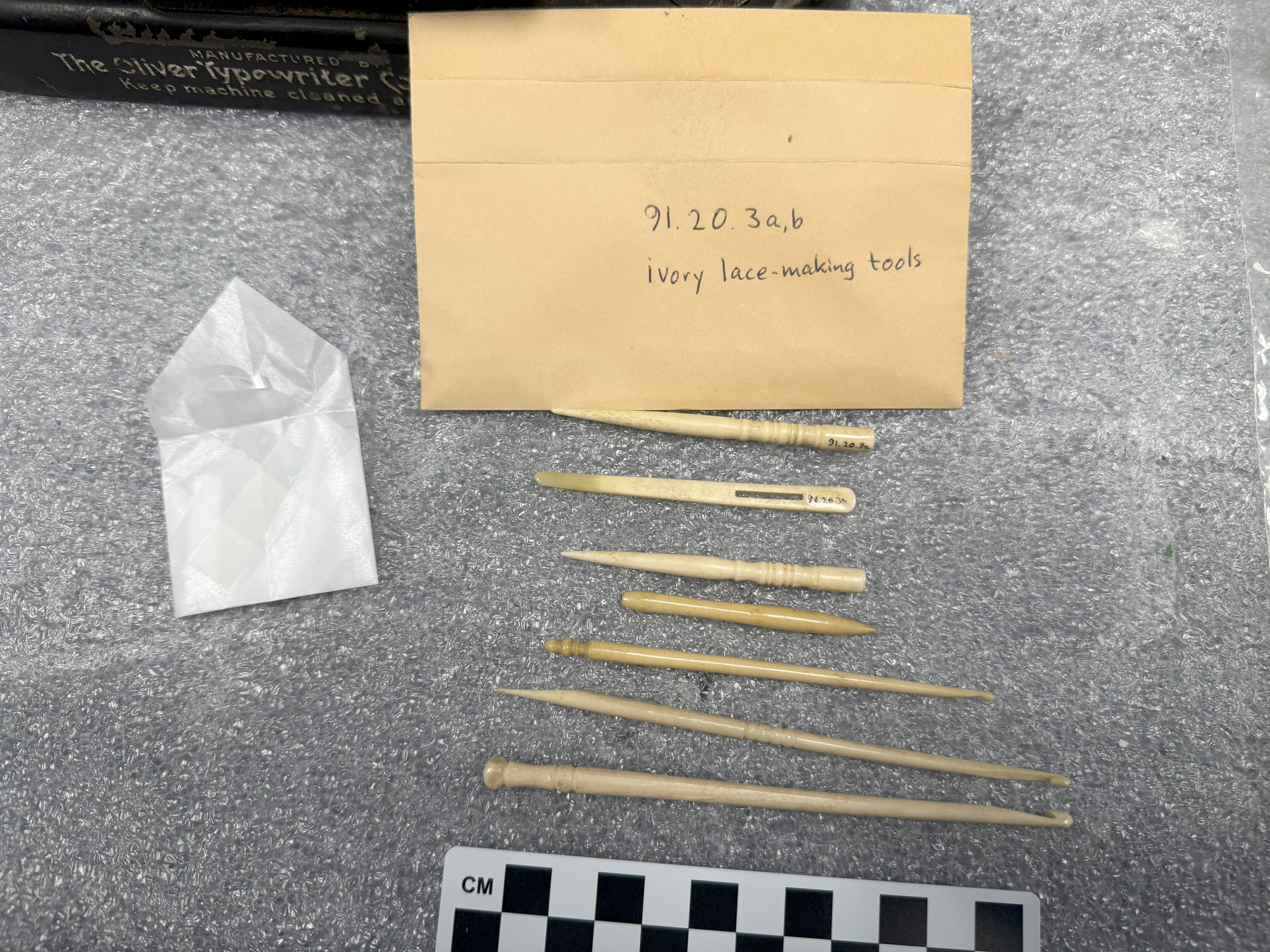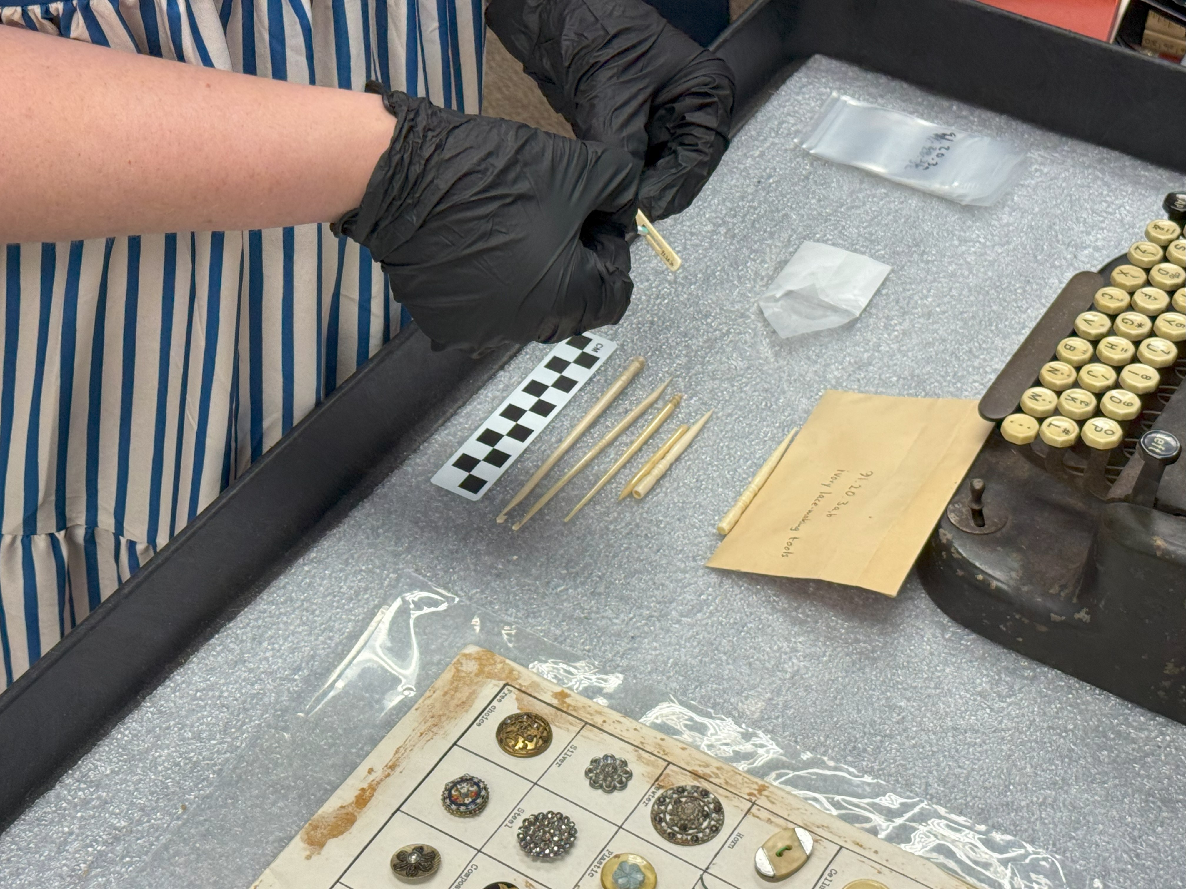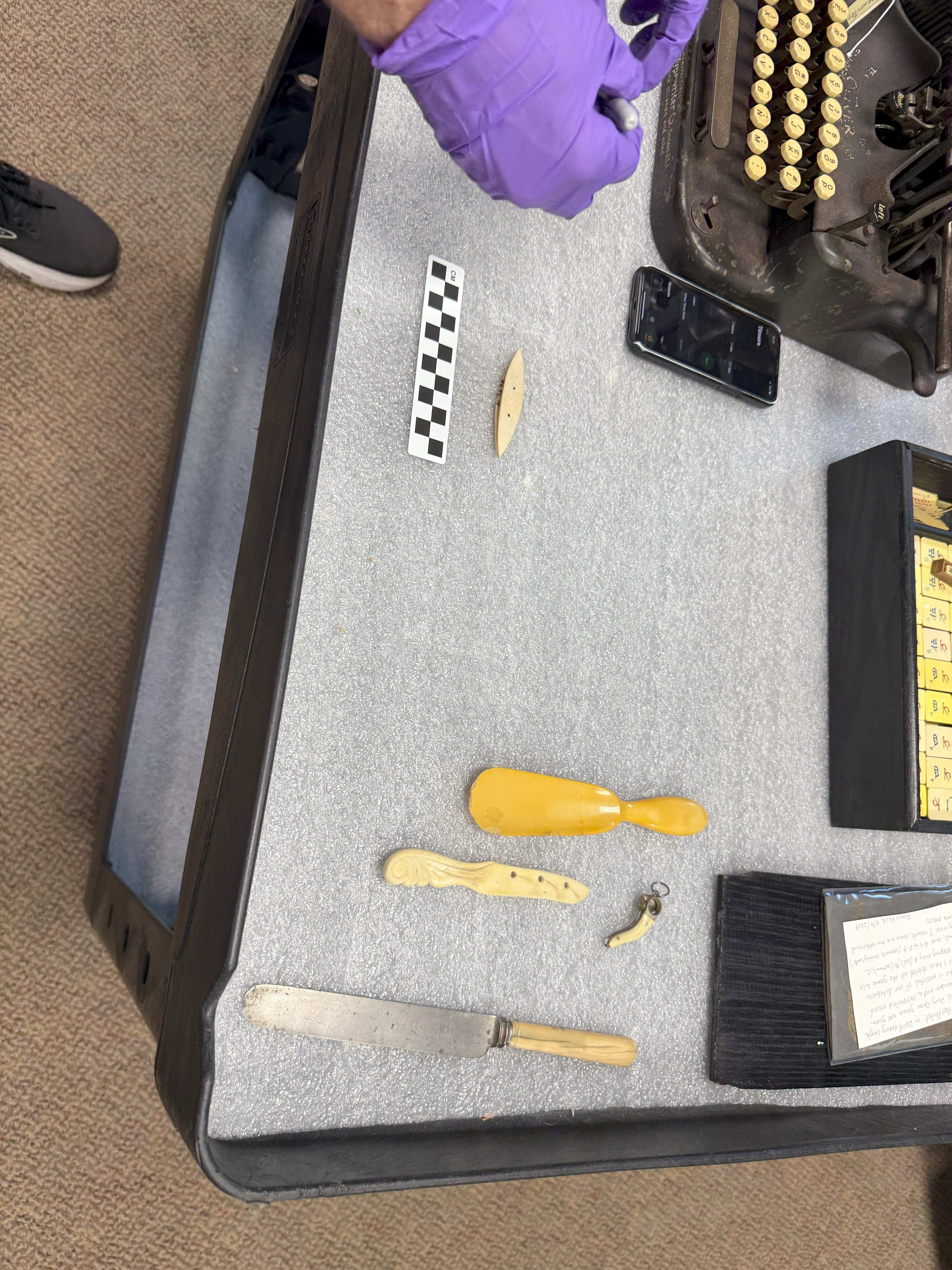 We were privileged to work with the team at the Monroe County History Center to perform ZooMS testing on a number of items, including an old lace kit and an organ from the 1800s! The pictures below show team members using tiny sticks, much like matches, to collect surface residues from the items. We then send these samples to our partners at labs across the country to analyze the results.